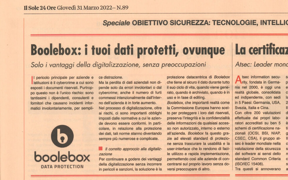 Boolebox su Il Sole 24 Ore: ”I tuoi dati protetti, ovunque”